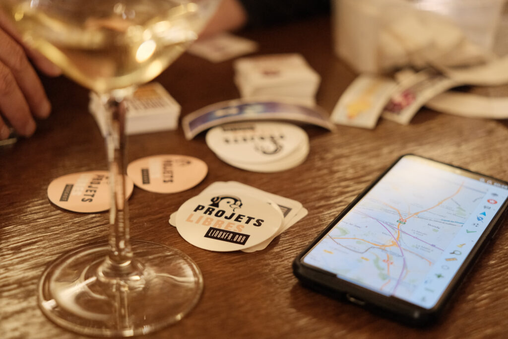 Free Projects stickers and LinuxFr.org, next to a phone running PostmarketOS with the Comaps app (credits: Benjamin Bellamy, CC-BY-SA 4.0)